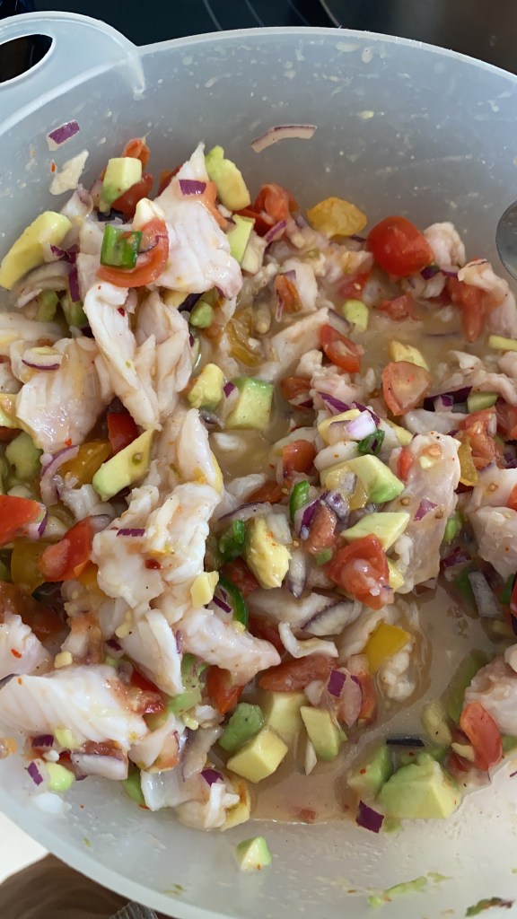 Tarjoiltiin nachojen, tortillalättyjen ja juuri leivotun leivän kanssa. Ceviche tulisi syödä samana päivänä pois, mutta tätä herkkua on vaikea jättää syömättä!