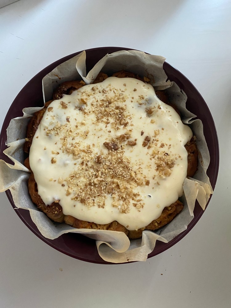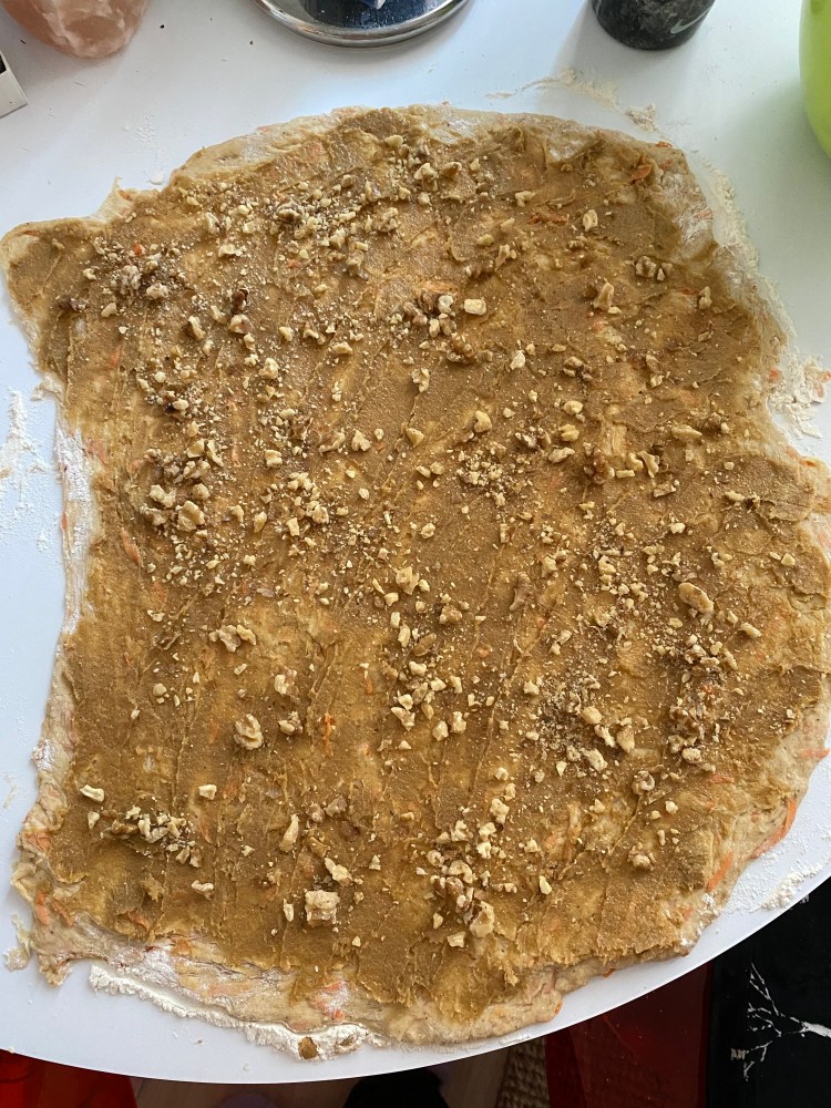 Näin Tiktokissa, kun käyttäjä @cloudykitchen väsäsi korvapuusteja porkkanakakku twistillä. Tämän nähtyäni lähdin heti kauppaan ostamaan tarvikkeita. Cloudykitchenin ohjeessa korvapuustin sisälle tuli kondensoitumaitoseos, jonka uskon olevan hitusen liian makea, joten laitoin sen sijaan perus fariinisokeri-voi yhdistelmän, johon lisäsin vielä pilkottuja saksanpähkinöitä tuomaan lisää makua ja crunchya!
