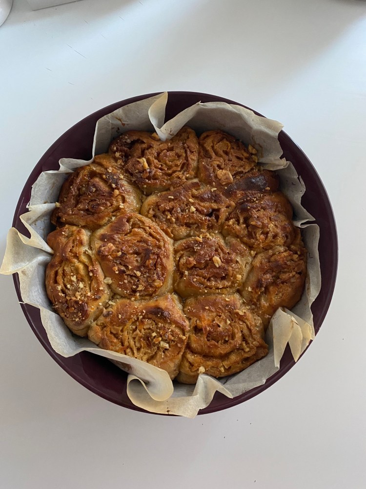Ennen ypsentämistä, voitele pullat kananmunalla ja ripoittele saksanpähkinöitä päälle. Kypsennä 200c uunissa yksittäisiä pullia 13-15 minuuttia, pullavuoka oli minulla uunissa 30 minuuttia, ja jäi sisältä hieman raa’aksi, kuten halusin. Jos siis haluat pullan kypsäksi, antaisin olla 35-45 minuuttia.