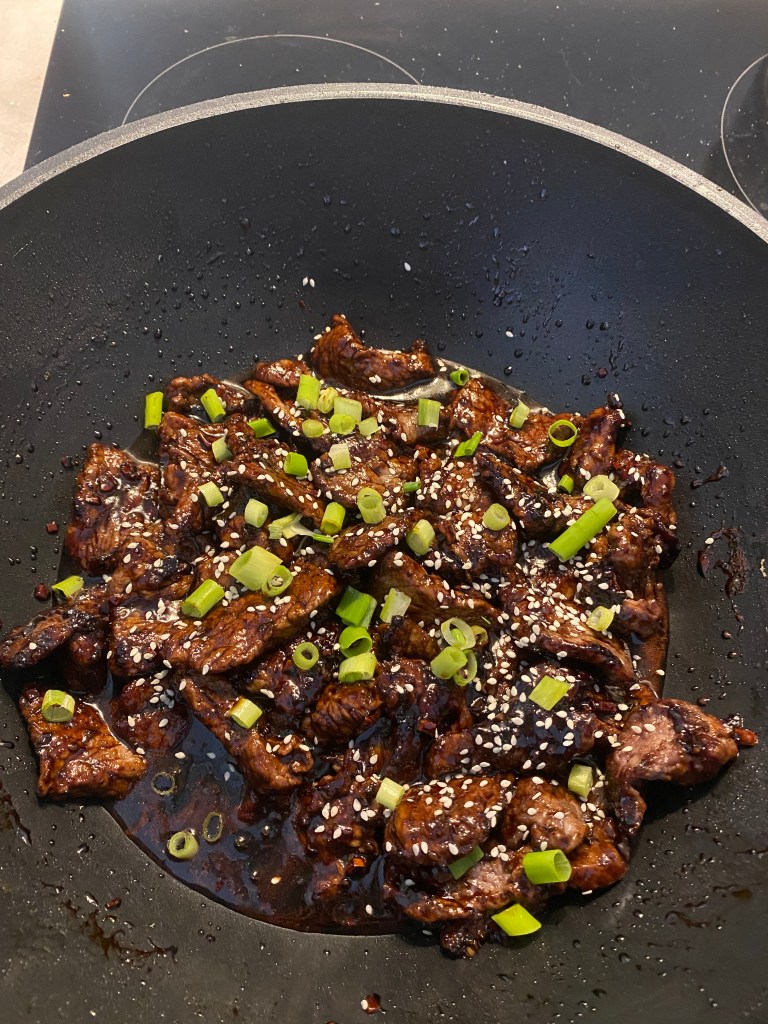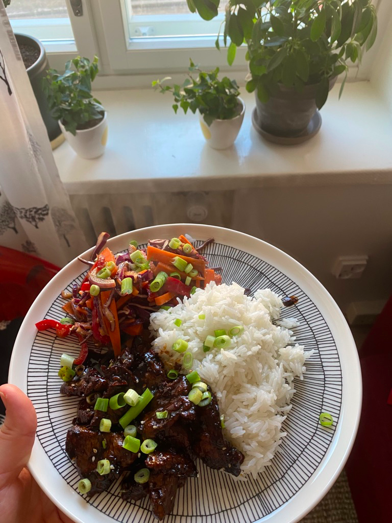 Paista pannulla lihan palat seesamiöljyssä muutamassa erässä. Anna lihoihin tulla rapea pinta ennen kuin otat pois pannulta. Kun olet saanut kaikki lihat kypsennettyä, tyhjällä pannulla paista lihojen nesteessä ja seesamiöljyssä valkosipuleita sekä inkivääriä noin minuutin ajan. Lisää aiemmin sekoitetut loput kastikkeen ainekset. Anna miedolla lämmöllä kastikkeen keittyä kasaan, itsellä tähän meni about 5 minuuttia. Kastikkeen tulisi muuttua siirappimaiseksi. Kun se on valmis, lisää lihat ja pyöräytä pariin kertaan, jotta lihan palat saavat kaikki kastiketta.